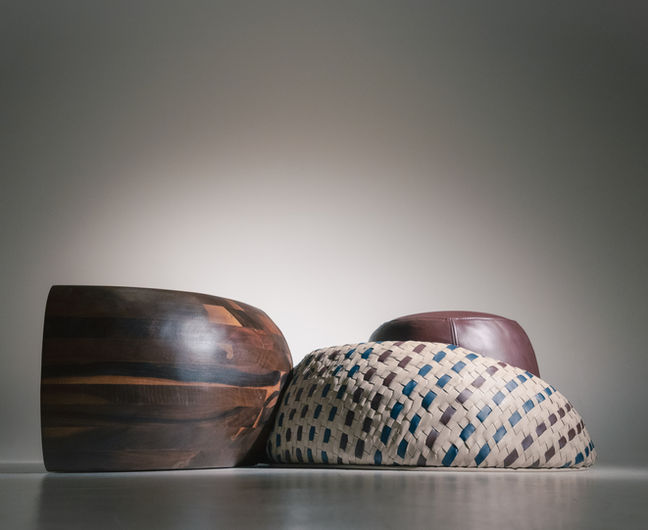 El tejido de piel inspirado en los colores del maíz. Sus tonalidades representan las distintas variedades de maíz . La suavidad del tejido contrasta con la dureza del pucté, creando una transición visual que envuelve y suaviza la estructura. El puff de piel actúa como el núcleo del grano, completando la lectura formal y simbólica de la pieza. La piel, al transformarse con el uso, aporta vida y evolución a un objeto que celebra origen, materialidad y permanencia.